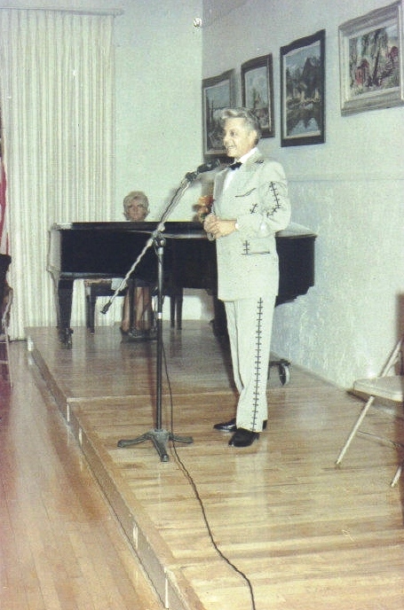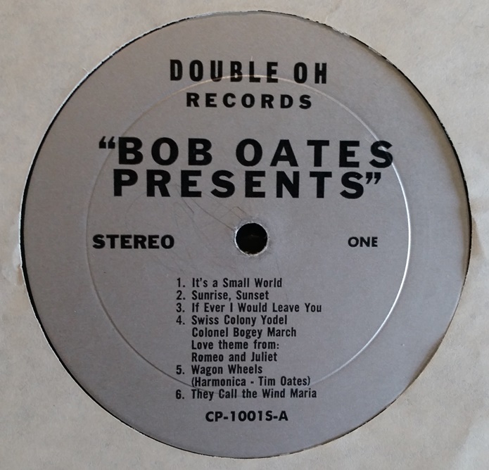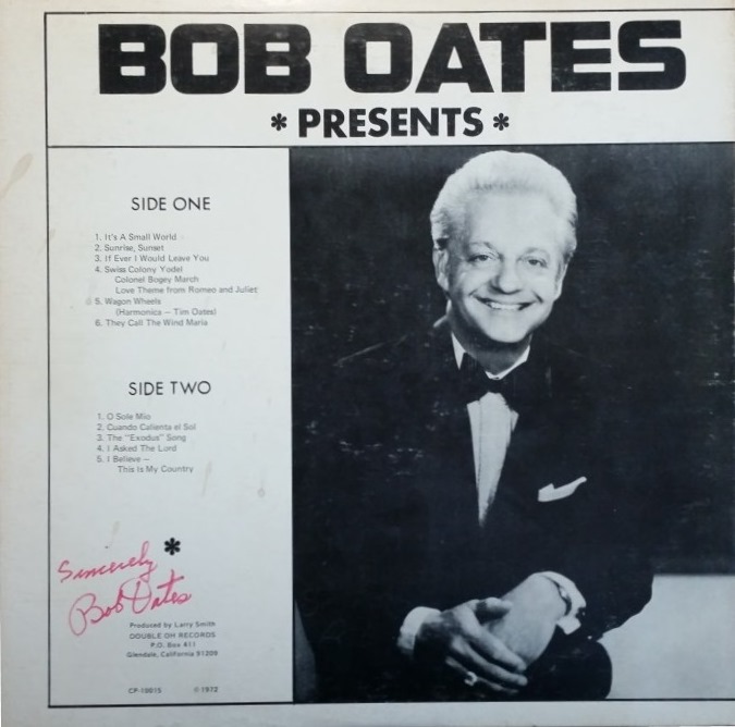 The bottom row shows Bob in various shots including a shot of him as the featured entertainer at the Fernanado Awards in 1972. Next is the publicity sheet from Amee Entertainment Association who at one time was Bob's booking agent. That's his wife, Louisa, pictured in the background. The picture was shot at the LA Music Center outside the Dorothy Chandler Pavillion. Lastly are pictures of the label and the front cover of one of his albums called "Bob Oates Presents" on which Tim played harmonica on the song "Wagon Wheels".