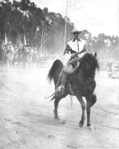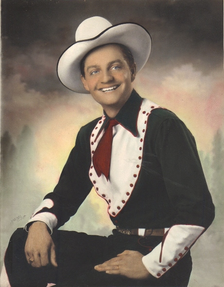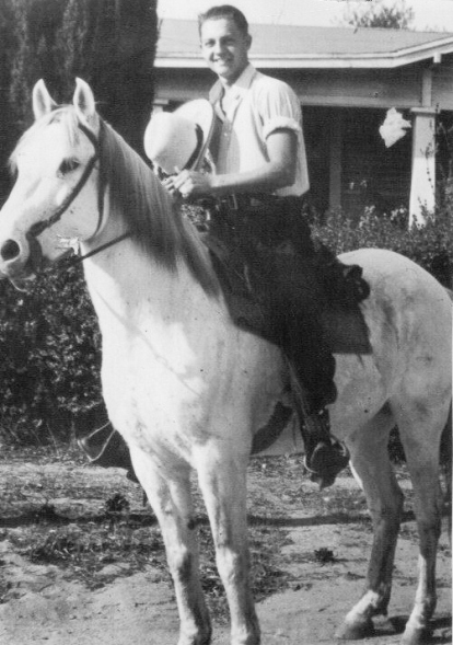 The top row of pictures are from some of the earlier years of Bob a la western garb. Left to right shows Bob in his teen years aboard his horse near the L.A. River. The color photo is one of Bob circa 1948 in a custom made western outfit which he won in a Tex Williams singing talent contest. Next is a picture of Bob serving as Grand Marshall in a 1948 parade in Chula Vista, California aboard his horse, Bomba. Also pictured are a couple of publicity shots.